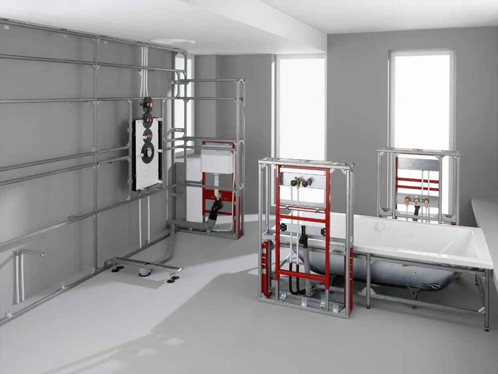 Опора крепится к основанию пола, затем в неё вставляется вертикальный профиль TECEprofil, который уже служит основой перегородки или фальшстены. Далее к профилям фиксируются сантехнические модули, коммуникации и облицовка.